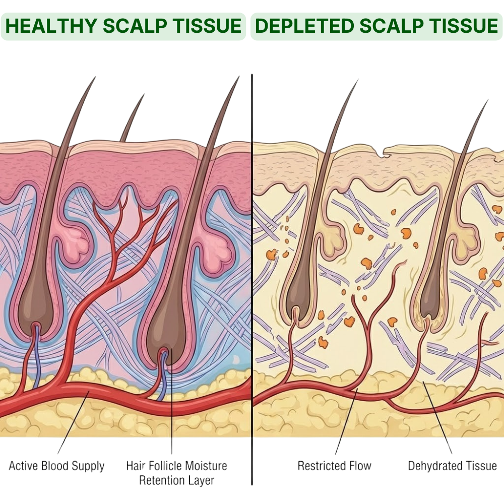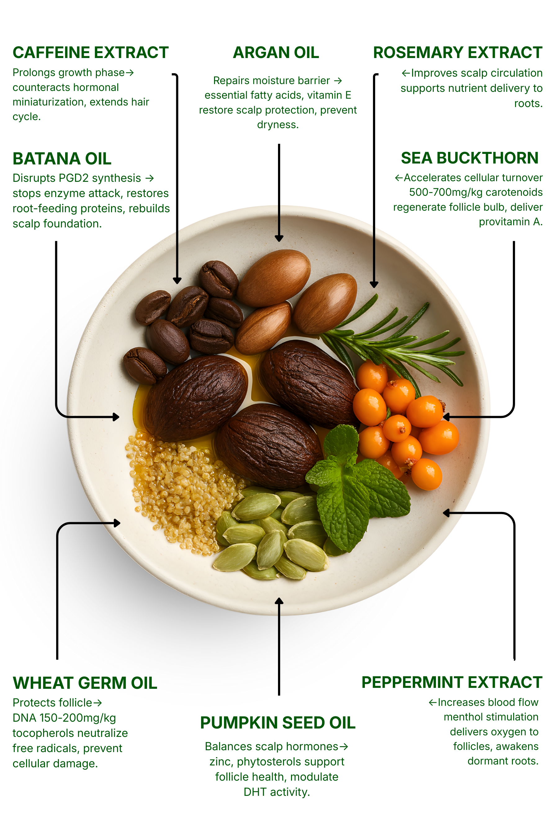 Our formula centers on Batana Oil, a rare Amazonian extract with 78% oleic acid—the highest natural penetration rate of any botanical. This acts as a molecular delivery system, carrying active compounds through scalp barriers to reach follicles trapped in hormonal shutdown.